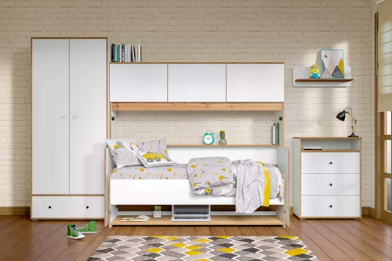 Светлая и аккуратная молодёжная мебель. Основой модульной системы является кровать-трансформер. Её столешница имеет постоянный горизонт, то есть при трансформации не нужно убирать вещи. Система хранения с подъёмными фасадами значительно расширяет функционал. Также имеются письменный стол с надстройкой и полкой, шкафная группа и комод с тумбочкой. Вместе они позволяют создавать разноразмерные композиции, примеры которых - на фото слева.