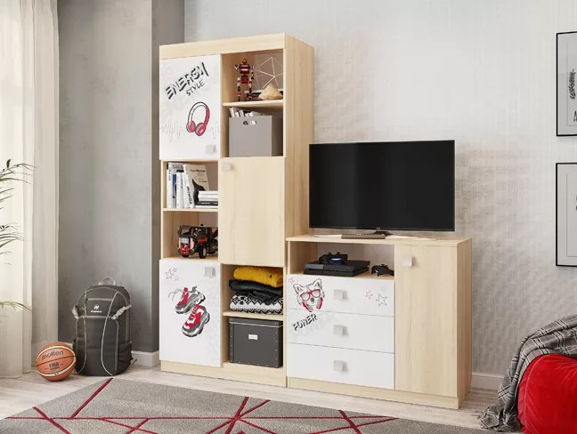 3 выкатных ящика, ниша и закрытые полки, все что нужно что бы разместить вещи вашего ребенка.  Эффектный принтерный рисунок на фасадах выдержан в общем стилистическом решении. Рисунок устойчив к истиранию и ультрафиолету. Открытая ниша для гаджетов, столешница толщиной 25мм, на которой с легкостью поместиться большой телевизор.
