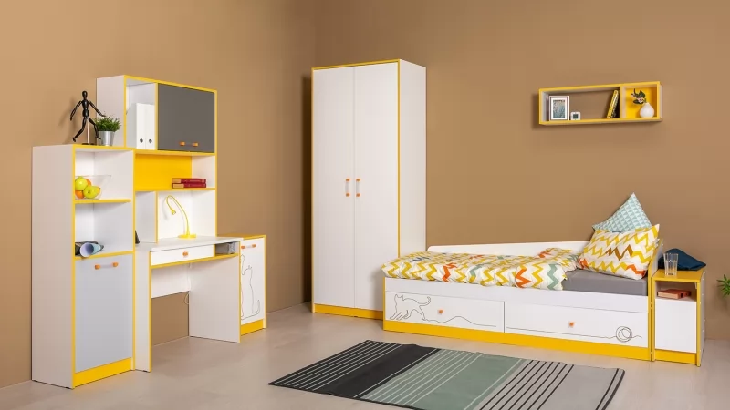 Многофункциональная модульная система Альфа для детской комнаты выполнена в модном сочетании монохрома и ярких, цветных, графичных линий. Особый акцент ставят прозрачные ручки с цветным основанием софт-тач. Коллекция изготавливается в двух цветовых решениях: жизнерадостный «солнечный свет» или свежий «зеленый лайм», можно создавать комбинации в одном цветовом решении или сочетать модули разных цветов между собой.