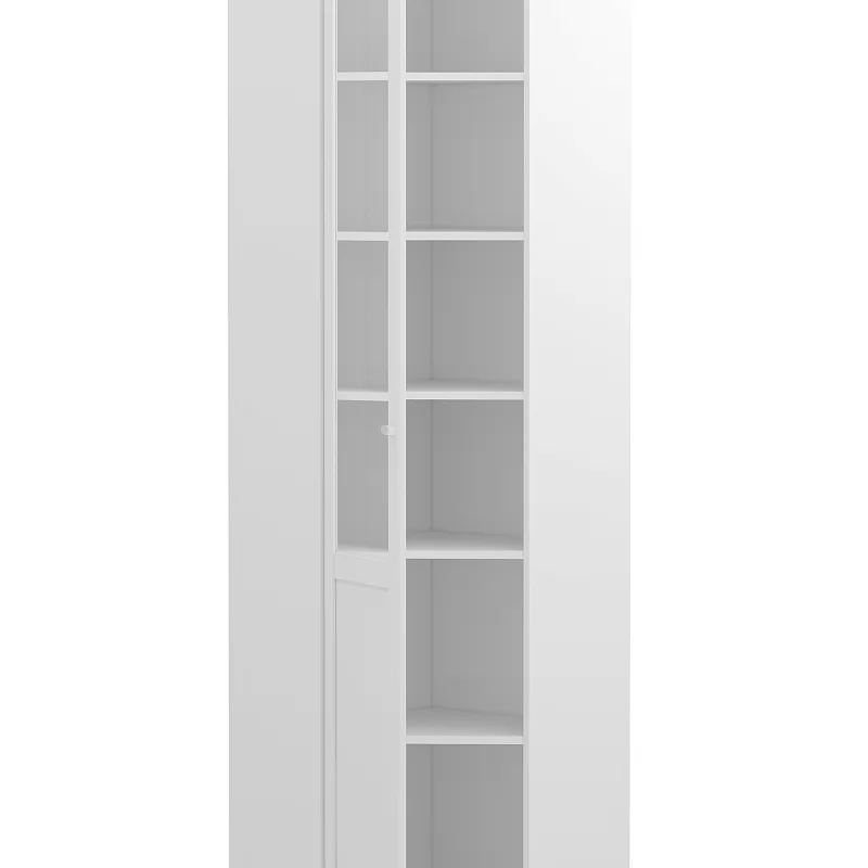 Книжный шкаф высотой 2107 мм поможет правильно организовать хранение книг и документов. Стеклянный фасад перенавешивается, это облегчит задачу при создании компоновки из шкафов в зависимости от планировки. За стеклянным фасадом из закаленного прозрачного стекла регулируемые по высоте полки из ЛДСП, что позволит разместить литературу различного формата. Книжный шкаф обязательно крепить к стене!