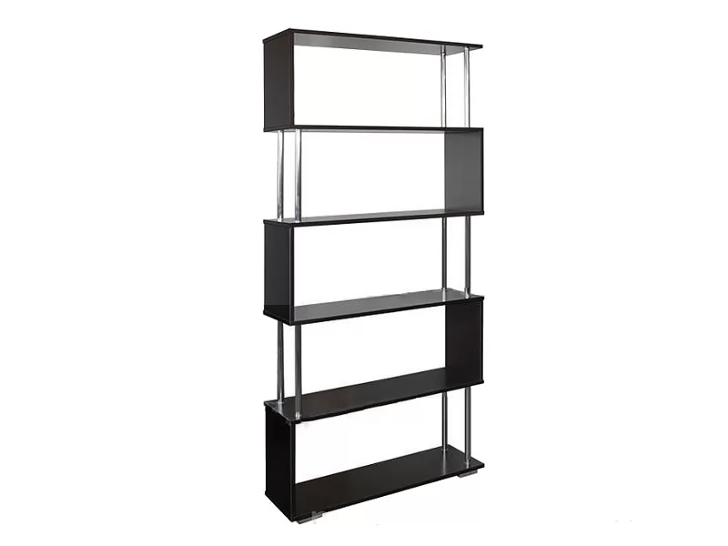 - на нем вы можете разместить все необходимые вещи, включая книги, предметы декора, домашние цветы или фотографии, - невесомости основным полкам стеллажа, выполненным в темном цвете венге, придают хромированные штанги.