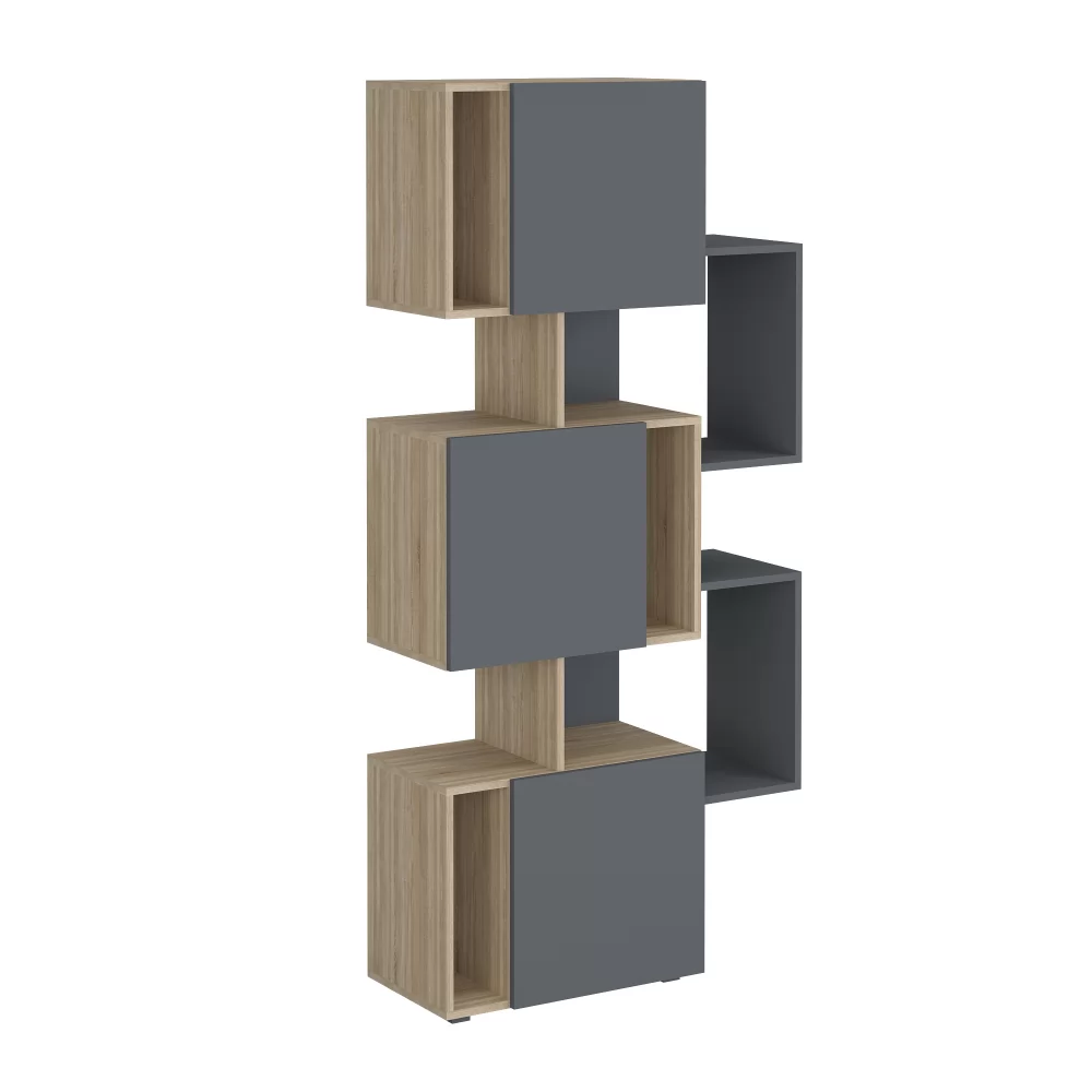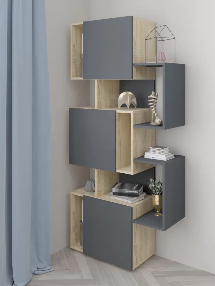 Сочетание материалов разных по цвету (Дуб Сонома и Графит), а также закрытых и открытых секций обеспечивает удобство хранения вещей.