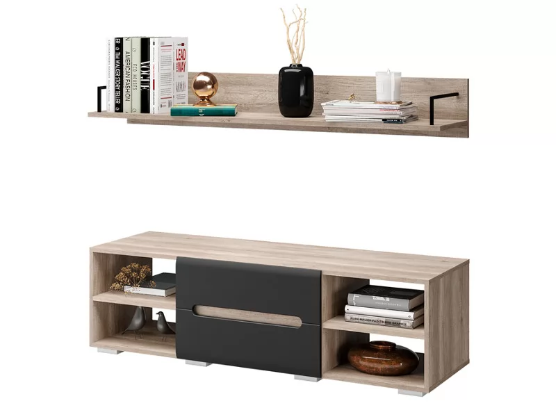 Стильная и очень вместительная комбинация из тумбы под ТВ и полки Наоми является частью одноимённой модульной серии.