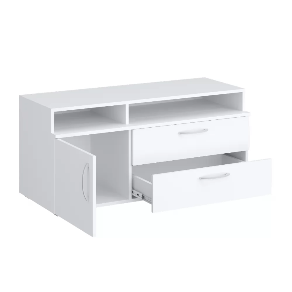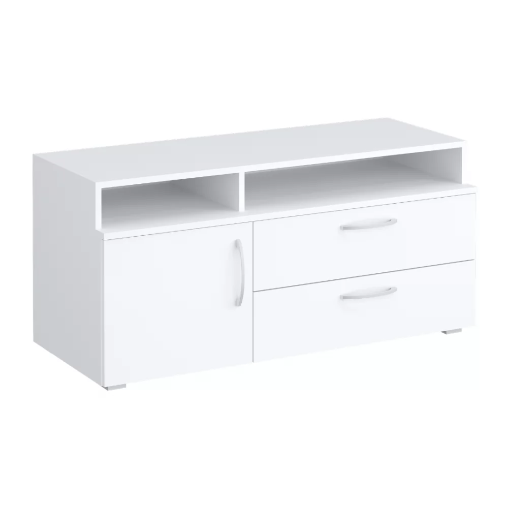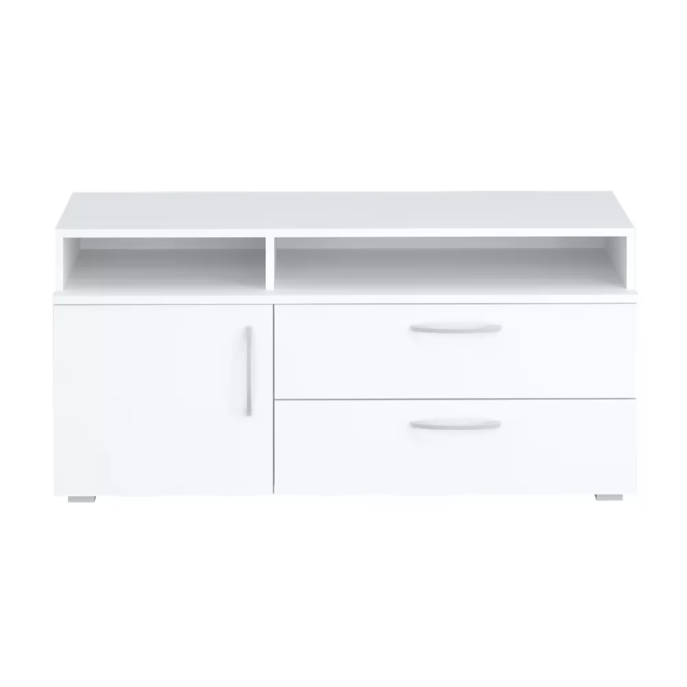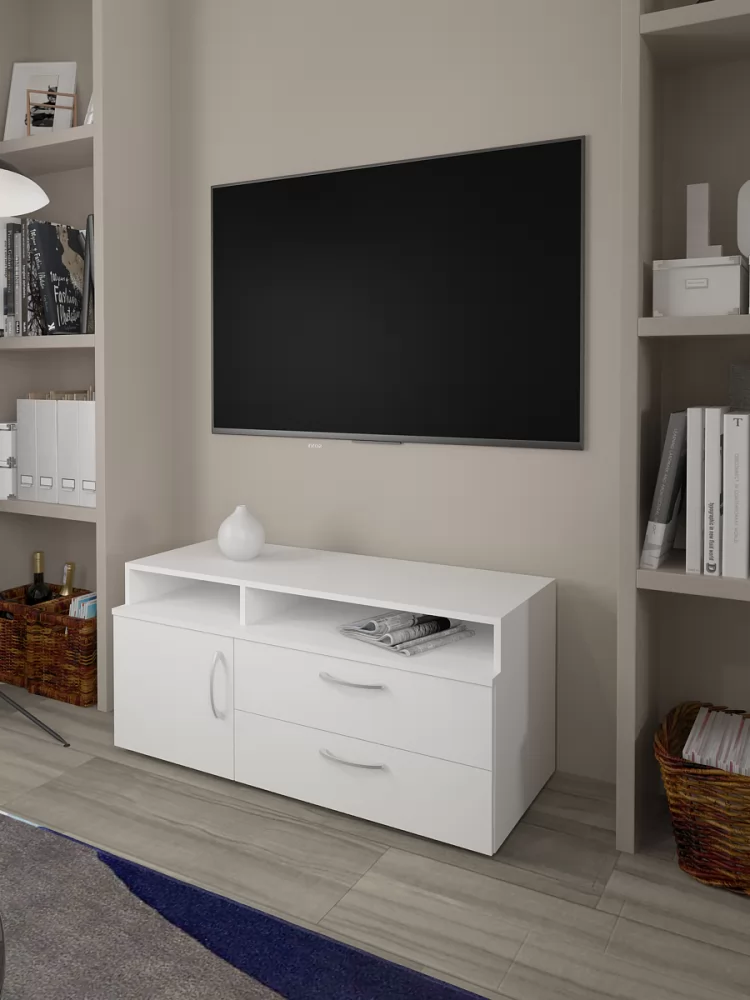 Современная низкая тумба под ТВ в универсальном белом цвете станет приятным акцентом вашей гостиной.