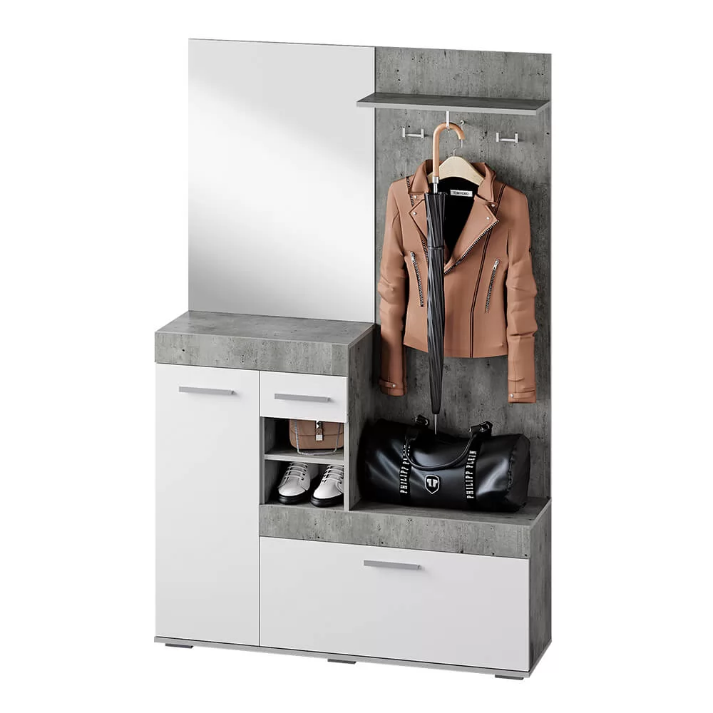 Сочетание белого цвета с фактурой бетона; Наличие большого зеркала облегчают конструкцию и позволяют ей расширить пространство; Все створки, за которыми спрятаны полки для хранения вещей и обуви, оснащены эргономичными хромированными ручками.