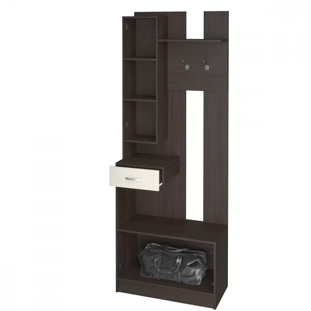 Вешалка отлично подойдет для небольшой прихожей - Ручка пластик - Нижняя тумба с распашными дверками - Ящик для мелочей на роликовых направляющих - Крючки металлические -Универсальная (зеркальная) сборка конструкцией не предусмотрена -Фасад открывается исключительно справа налево