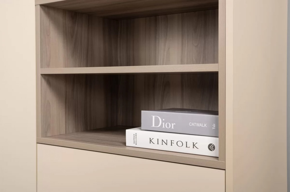 Благодаря нейтральному светлому оттенку и универсальности декора модули можно разместить в спальне, гостиной, прихожей.