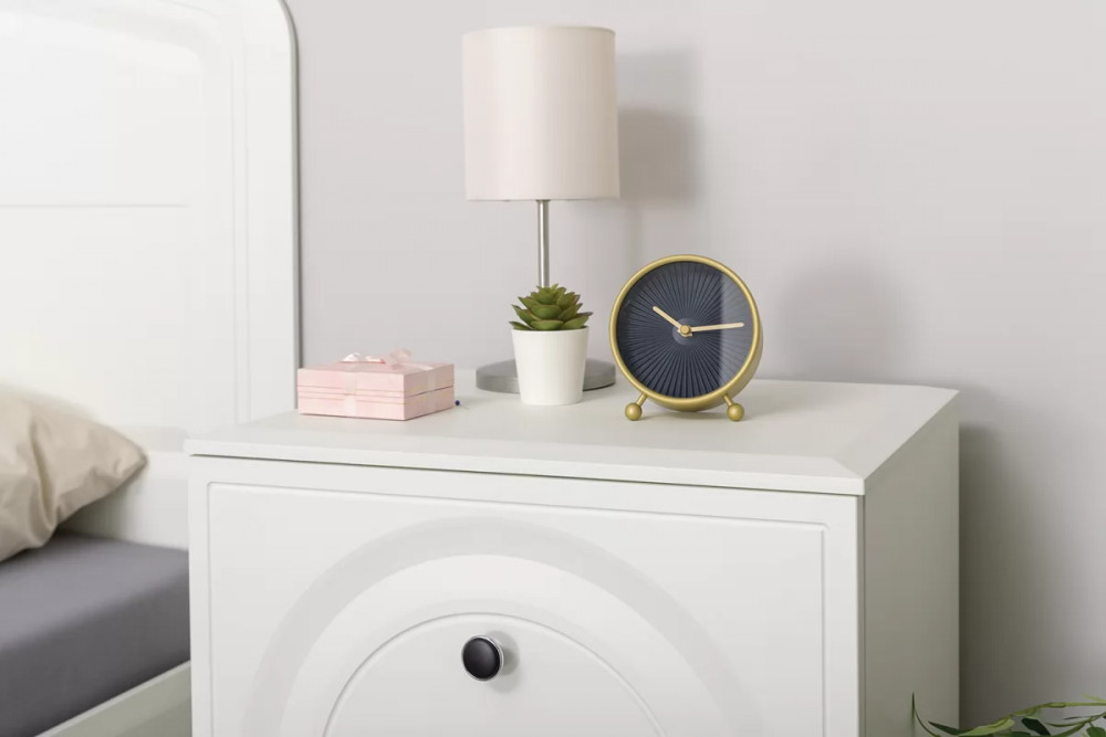 Основным декоративным элементом коллекции является круг. Явно представленный фрезеровкой по фасадам тумбы, комода, в изголовье кровати и ручках-кнопках.