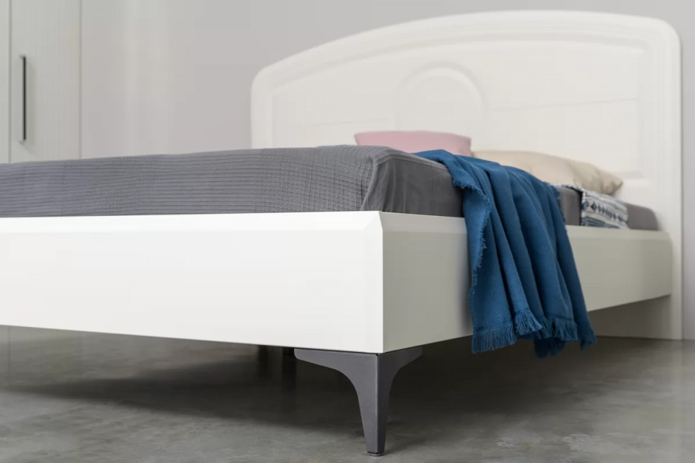 Кровать установлена на высокие ножки, что делает конструкцию лёгкой и воздушной, изголовье кровати декорировано пышным мягким элементом.