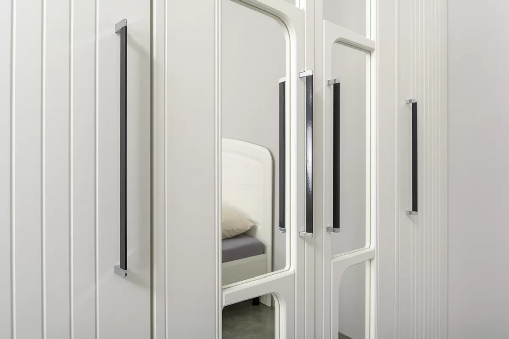 Фасады выполнены из МДФ с матовой ПВХ-плёнкой. Такое решение делает мебель визуально более "мягкой", комфортной и расслабляющей, что особенно актуально для спальни.